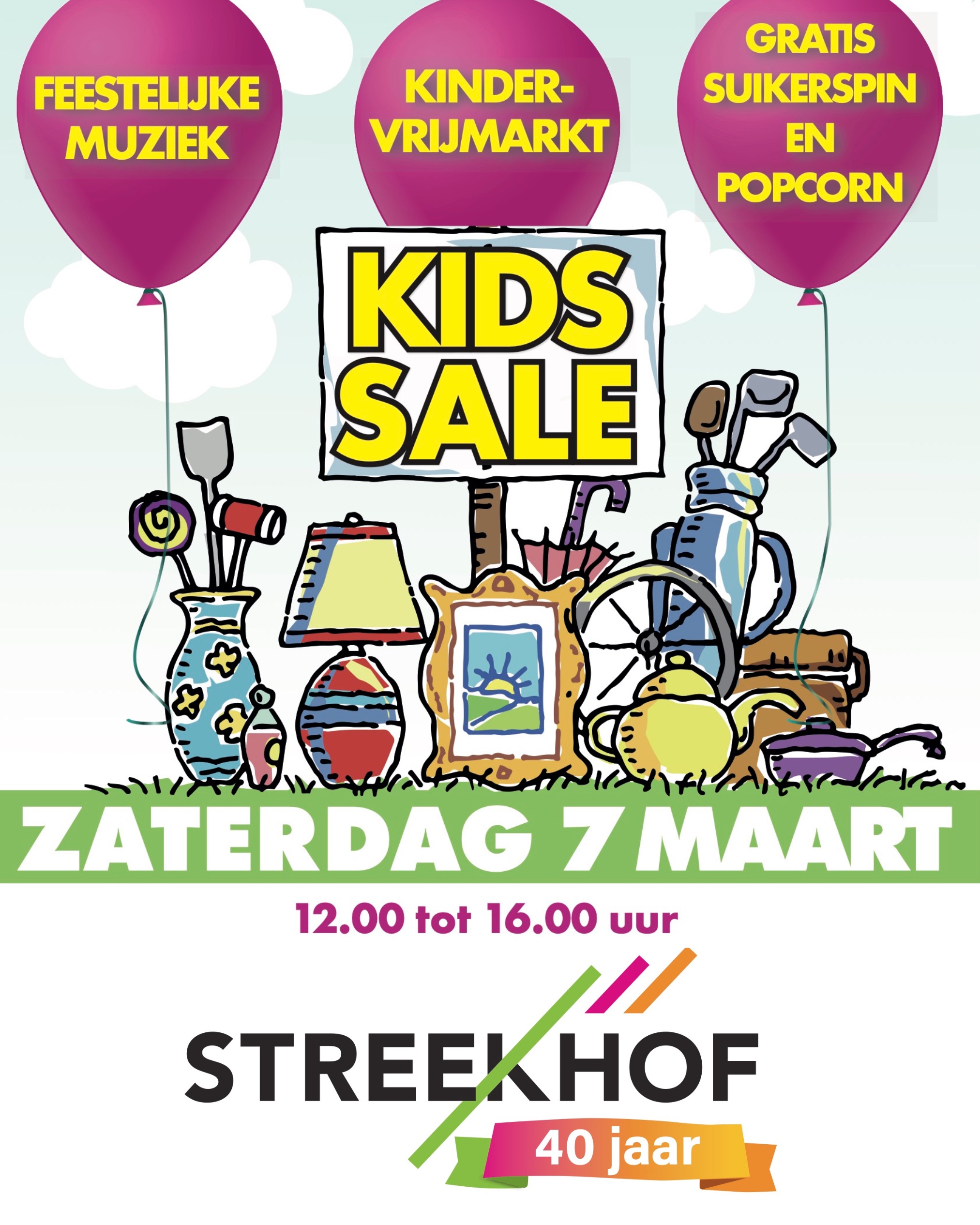 Tussen 12.00 en 16.00 uur verkopen kinderen hun oude spulletjes en speelgoed in een kraampje in het jarige winkelcentrum. Maar liefst 60 jeugdige standhouders hebben zich hiervoor aangemeld. Aanmelden om zelf een standje te bemannen is helaas niet meer mogelijk, maar kom vooral naar het centrum om langs de kramen te struinen op zoek naar mooie aanwinsten. Ook zijn er diverse ondernemers die een kraam inrichten met Sale artikelen, is er live muziek en trakteert het jarige Streekhof op popcorn en suikerspin.