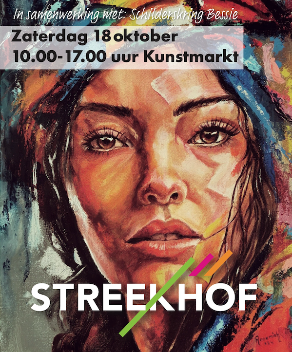 De kunstmarkt sluit de Kunst in de Etalage dagen af op zaterdag 18 oktober. In de wandelgangen van Streekhof richten leden van Kunstkring Bessie een kraam in met hun schilderijen en andere kunstwerken en kun je hen live aan het werk zien. Een mooie gelegenheid om kennis te maken met de mensen achter de kunst. Naast schilderijen zijn er ook andere kunststukken te bewonderen waaronder keramiek, bestek bewerkt door laswerk, collages uit de natuur, litho's, beelden, kaarten en gedichten. De kunstmarkt vindt plaats tussen 10.00 en 17.00 uur.